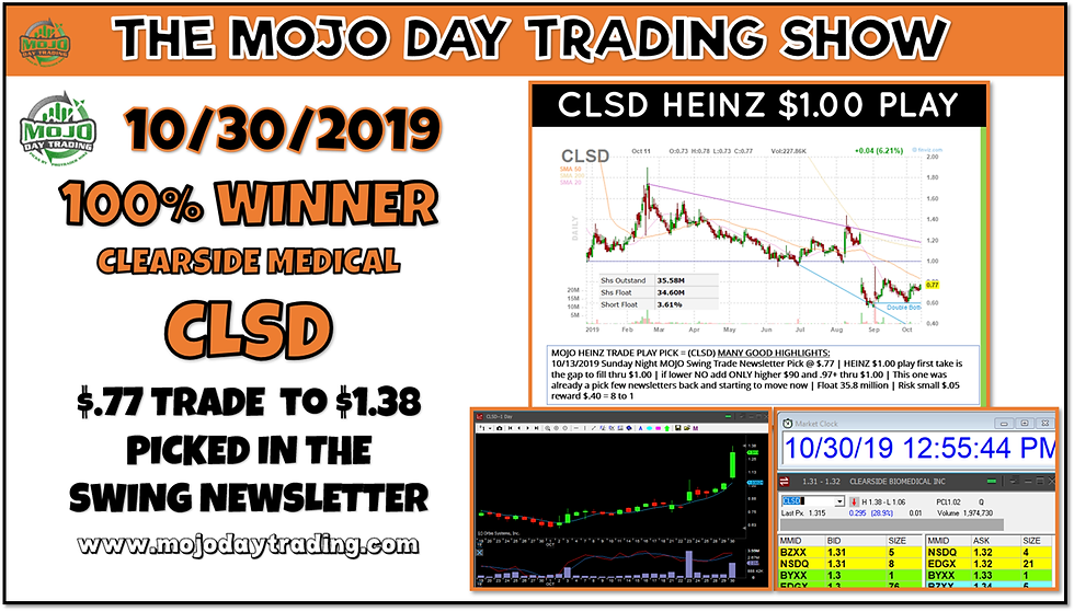 MOJO Day Trading is a provider of stock market education. MOJO Day Trading is not a registered as an investment adviser either with the U.S. Securities and Exchange Commission or any other federal, governmental or regulatory authority. The business services and activities of MOJO Day Trading do not requires any such registrations. You understand and acknowledge that there is a very high degree of risk involved in trading securities. The Company, the authors, the publisher, and all affiliates of Company assume no responsibility or liability for your trading and investment results. It should not be assumed that the methods, techniques, or indicators presented in these products will be profitable or that they will not result in losses. Past results of any individual trader or trading system published by Company are not indicative of future returns by that trader or system, and are not indicative of future returns which be realized by you. In addition, the indicators, strategies, columns, articles and all other features of Company's products (collectively, the "Information") are provided for informational and educational purposes only and should not be construed as investment advice. Examples presented are for educational purposes only. Such picks, alerts, set-ups are not solicitations of any order to buy or sell. Accordingly, you should not rely solely on the information in making any investment. Rather, you should use the Information only as a starting point for doing additional independent research in order to allow you to form your own opinion regarding investments. You should always check with your licensed financial advisor and tax advisor to determine the suitability of any investment. Any and all information discussed is for educational and informational purposes only and should not be considered tax, legal or investment advice. A referral to a stock, commodity, cryptocurrency is not an indication to buy or sell that stock, commodity or cryptocurrency.